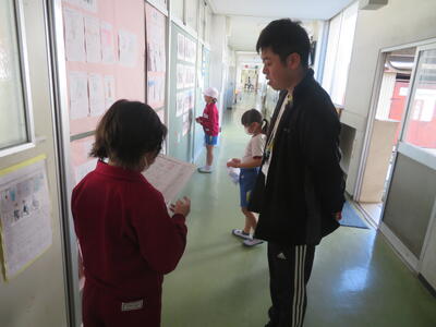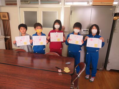 さっそく、50周完走した子供たちが、校長室へオリジナルステッカーを受け取りにきてくれました。