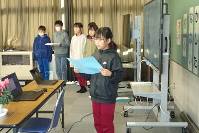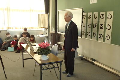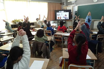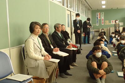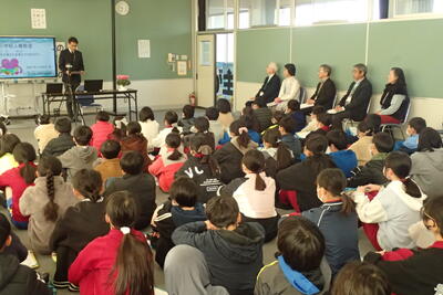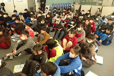 本校では、12月8日(月)~12月12日(金)までの1週間を人権週間として位置づけています。今日は、2校時に益子町人権擁護委員の皆様をお招きし、人権集会を行いました。現在、体育館が空調設備工事のため、オープンスペースには5、6年生が集合し、1~4年生は、オンラインで参加し、実施しました。