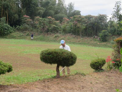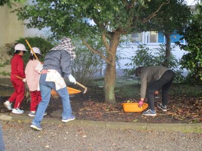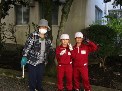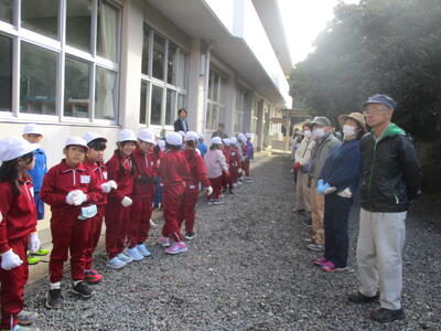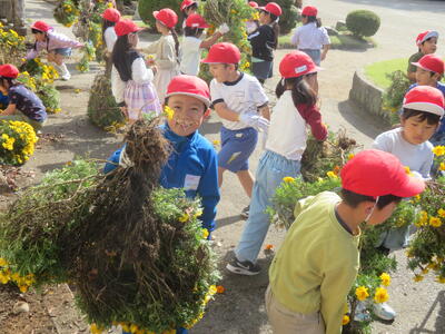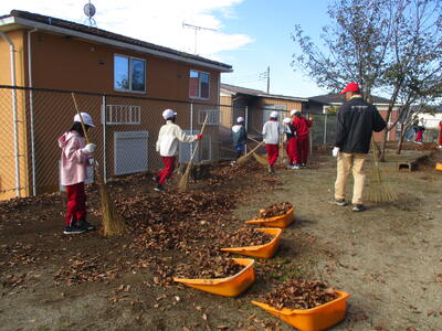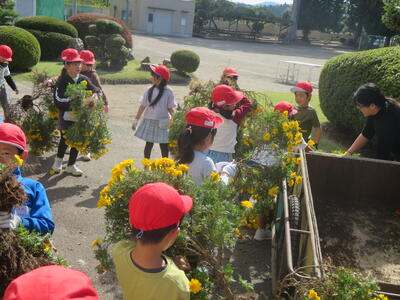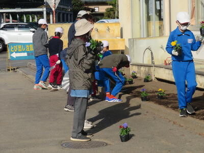 2年生、4年生、6年生が祖父母の皆様と除草や落ち葉掃き、花植えなどを行いました。