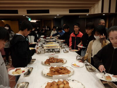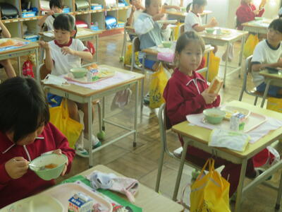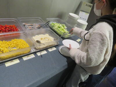 栄養指導の後、給食の様子を見に行くと、野菜の入ったオニオンスープやポテトサラダをもりもり食べている姿が見られました。
