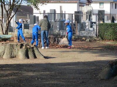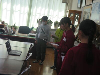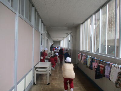 給食委員会は、各学級の配膳台の消毒を行っています。保健美化委員会は、安全点検を行っています。飼育栽培委員会は、飼育小屋の清掃等を行っています。図書委員会は、アンケート結果の集計をしています。運動環境委員会は、校庭の小石を拾う作業をしています。放送委員会、企画委員会は、2学期の反省点を話し合っています。