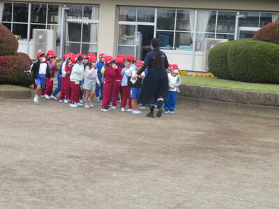 初めに、地震が起こった設定で、机の下に避難しました。そこから、火災が発生した設定で第1避難場所である校庭に避難しました。