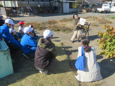 絵本の読み聞かせを聞きたいという子供たちが集まり、大豆畑の前での読み聞かせに参加していました。