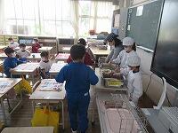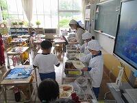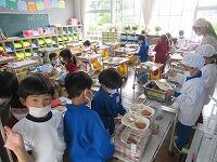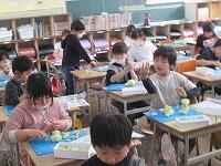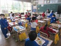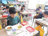 給食の様子です。今日の給食は「こどもの日お祝い献立」で、三色丼、玉ねぎのみそ汁、クリームソーダ風ゼリー、牛乳でした。三色丼は、鶏・卵そぼろと、さやいんげんの刻み和えです。給食センターの調理員さんたちの工夫や一手間により、子供たちが食べやすいメニューに仕上がっています。みんなおいしそうに笑顔でいただいていました。