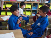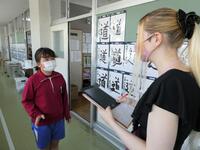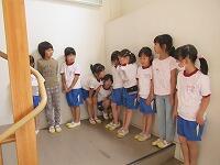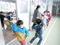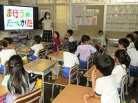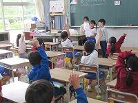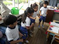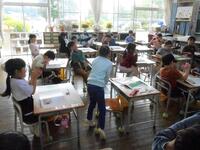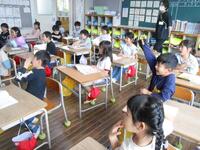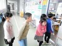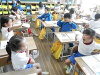 1・2組ともに生活科では「がっこうたんけん」の練習をしていました。4月に実施した2年生と合同の学校探検のときには、リードする2年生たちについて行くだけでしたが、今回は1年生だけで数カ所を探検するようです。廊下は走らずに右側を歩くことや「しつれいします」~「しつれいしました」の一連の流れを確認しました。