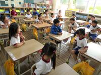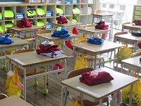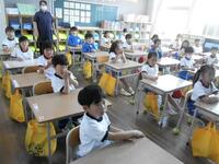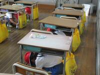 1組の生活科の学習は、「あんぜんながっこうせいかつ」について、地震になったときの避難の仕方を確認しました。落下物から身を守るために机の下にもぐりました。みんな上手に頭や体をすっぽり隠していました。