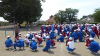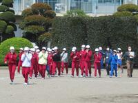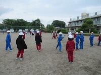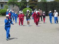 子供たちは通学班ごとに並び、校庭と周辺道路のコースを歩行練習しました。