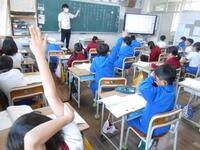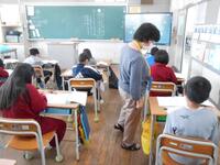 今週から教育実習生のT川先生は授業実践に入り、今日は6-1国語と道徳の授業を担当していました。写真は4校時、校庭で1・2年生の合同体育、3年生は音楽と理科、4年生は国語と道徳、5年生は書写と社会、6年生は国語と外国語の授業の様子です。