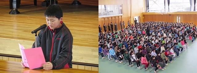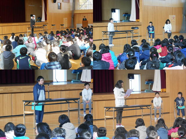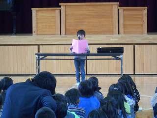 2学期の終業式が行われました。校長先生のお話を聞いた後、3人の児童代表の作文発表がありました。3人ともすばらしい内容の作文でした。