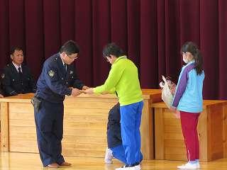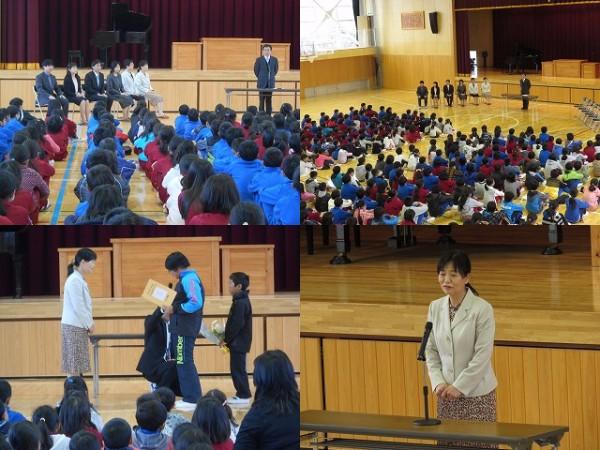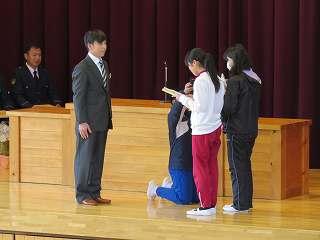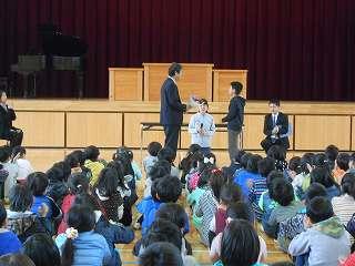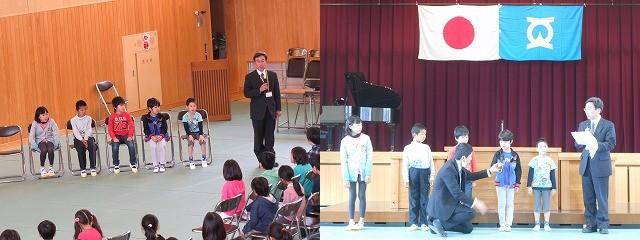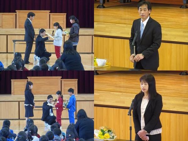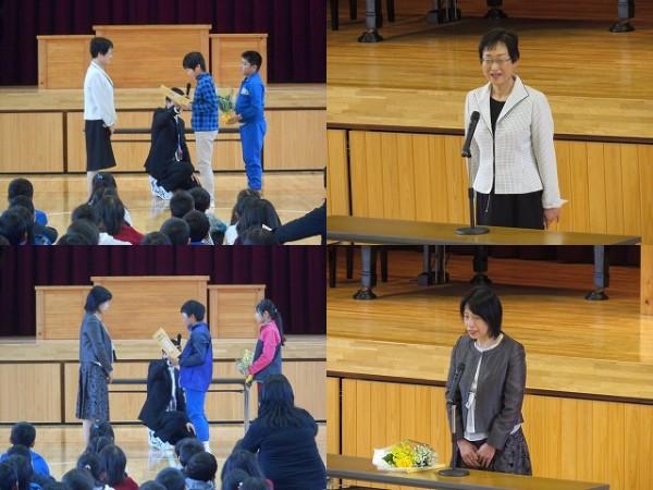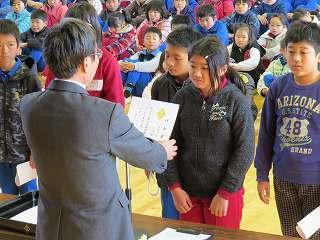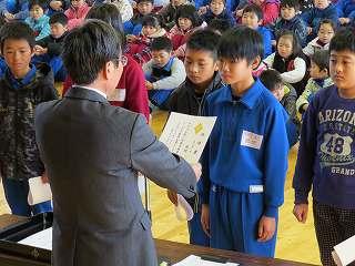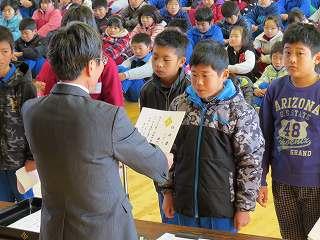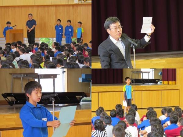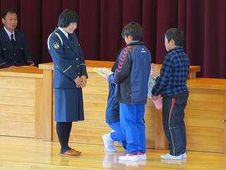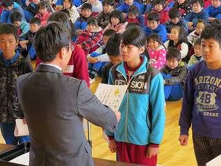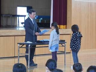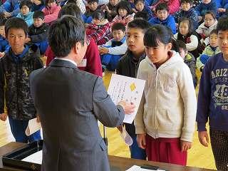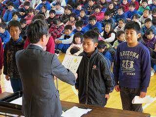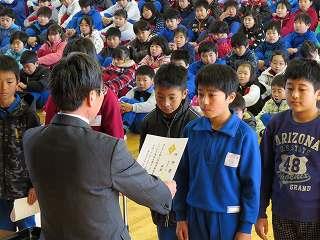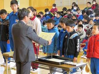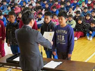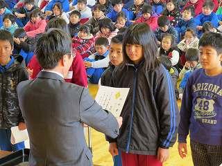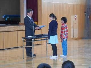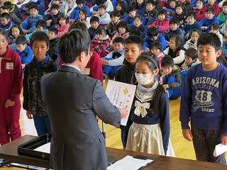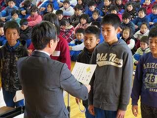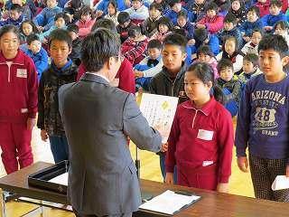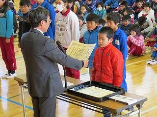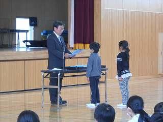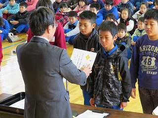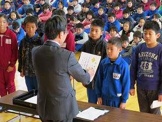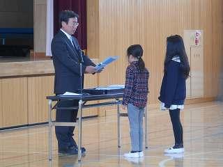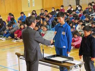 賞状伝達がありました。校内マラソン大会、バレーボール大会、町児童生徒連絡協議会標語コンクールの表彰を行いました。