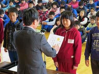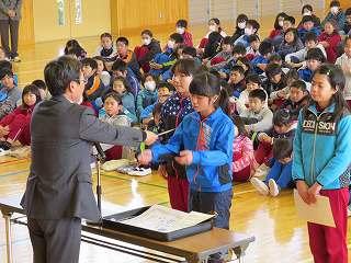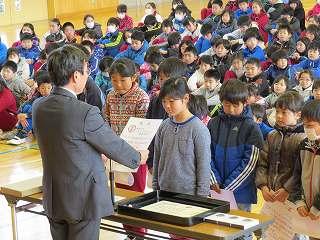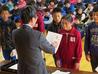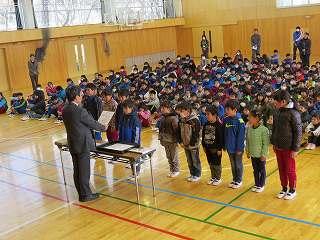 今日の業間に学級委員任命式がありました。3学期、学級の中心となって活躍する子たちです。校長先生から一人一人任命書を渡してもらった後、後ろを向いて全校生にやる気いっぱいの顔を見せました。3学期がんばってください。