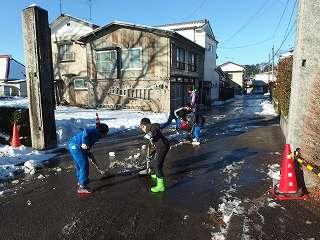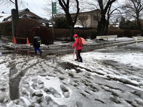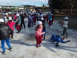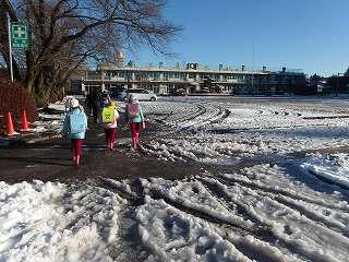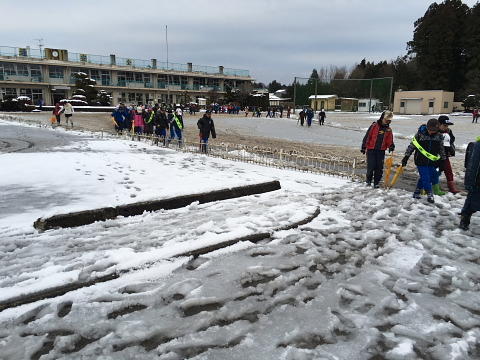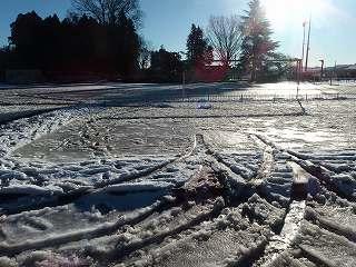 昨日の雪が凍って、道路や校庭がつるつるになってしまいました。特に校庭は、一面が氷になって子供たちは歩くことができませんでした。幸い、登校時に転倒してけがをする子はいませんでした。下校時も気を付けて歩いてほしいと思います。今日は5、6校時に自由参観があります。駐車場については昨日のメール配信でお知らせしたとおりです。校庭には駐車できません。どうぞよろしくお願いします。