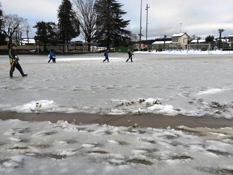 午後4時の校庭 下校時の様子 夕方になって校庭の雪は溶けてシャーベット状になっていました。明日の朝、校庭は一面が氷になるように思われます。