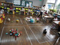 身近な物で、円柱、三角柱、直方体、球などの形の特徴を知り、その違いを学習します。