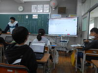 chromebook(クロームブック)を効果的に活用し、みんなの意見を電子黒板に集約しながら進め、いじめ問題にどう立ち向かうかを考えていました。