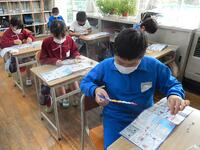 益子小学校栄養教諭K先生より、今日は1年生が「よいたべかたをしよう」の指導を受けました。指導後はワークシートに『家でごはんを食べるときにがんばること』として苦手な食べ物にもチャレンジすることを書き込んでいた子供たちでした。