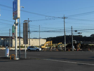 スクールバス停横の交差点の東南かどが工事中でした。「セブンイレブンができるってお父さんが言ってた」との情報です。『あら』(^^)