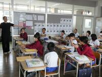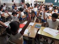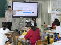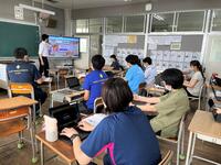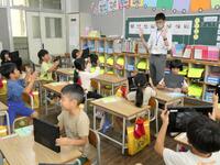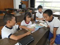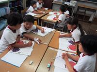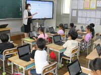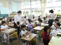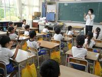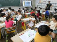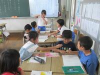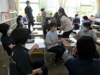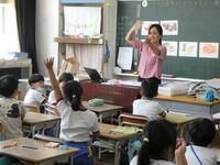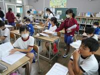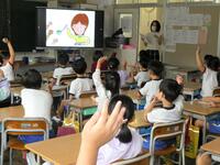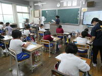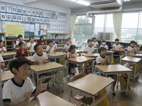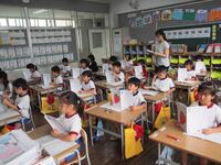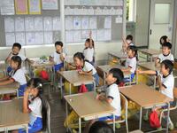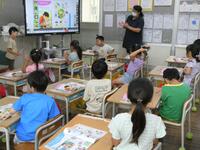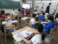 5・6年生の外国語の授業の様子です。5年生の学習内容は「He can ~. She can ~.」身近な人の‘’できること‘’の表現の仕方を練習していました。6年生は「夏休みにしたこと」を英語で紹介するための文法や単語を学習していました。4クラスとも担当の先生たちと和やかに会話をしながら取り組んでいました。