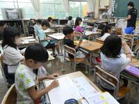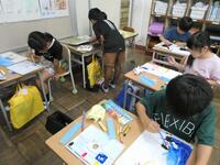 4-2国語「暑中見まいの書き方」書きたい相手に出すハガキをていねいに仕上げていました。
