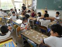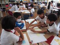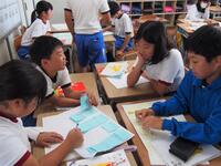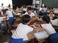 3年生の外国語活動は、絵カードを切り取って2人組での果物カード対決です。国語は話し合い活動を進めていました。