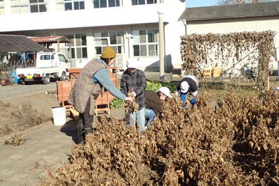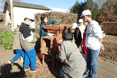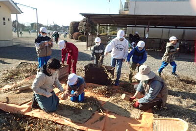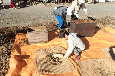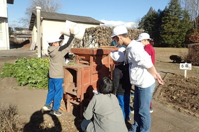 食育菜園ボランティアの皆さんと大豆の収穫と脱穀体験