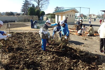 2年生、4年生、6年生が祖父母の皆様と除草や落ち葉掃き、花植えなどを行いました。