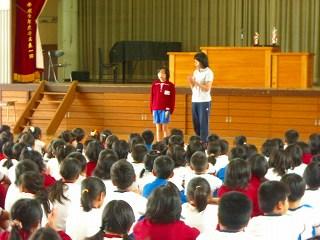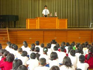 みんなの時間に音楽集会がありました。今日は「London Bridge(ロンドン橋)」を英語で歌いました。みんなで橋を作って歌いながらくぐったりしたので楽しかったです。また、1年生がしっかり覚えた校歌を、みんなの前で大きな声で歌ってくれました。