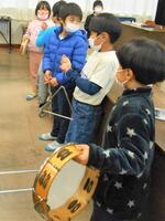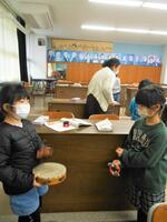 1-1音楽「がっきのおとでよびかけっこしよう」トライアングルやカスタネット、すず、タンブリンなどの楽器を使って、音を聞き合ってやりとりする学習内容です。楽器の音色やならし方の特徴を確認したり、強弱やリズムを意識したりしながら発表し合っていました。同じ楽器でも、ならし方で全く違う音色になることに気付きましたね。