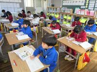 1-1生活「見つけたあきをひょうげんしよう」、1-2算数「くり上がりのあるたしざん」、2-1国語「あそび方をせつ明しよう」、3-1総合「益子特別支援学校との交流」、3-2理科「日光を集めたとき」、4-1社会「残したいもの伝えたいもの」、4-2書写「毛筆・竹笛」の授業の様子です。
