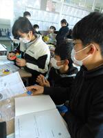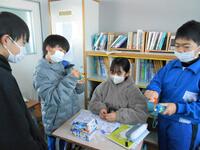 6-1理科「コンデンサーにたくわえた電気の利用」発電して蓄えた電気を使うことができるか?こちらは実験キットを使い、豆電球と発光ダイオードに明かりが付いた時間を調べていました。