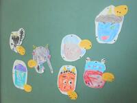 1-2図工「えのぐをつけたかたちから」いろいろな色を考えて表現を工夫する学習です。友達と互いの作品を見合いながら内容や感想を伝え合っていました。