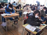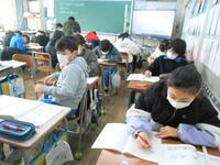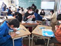 5-2家庭「ミシンにトライ!手作りで楽しい生活」エプロン製作中でした。布を裁断したり、まち針を打ったり、アイロンをかけたり、慎重に作業を進めていました。仕上がりが楽しみです。