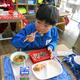 今日の給食は6年2組が発案した献立です!わかめごはん、鶏のからあげ、マカロニサラダ、豚汁、牛乳でエネルギー751kcalでした。栄養満点のメニューを1年生も嬉しそうに食べていました。(^_-)