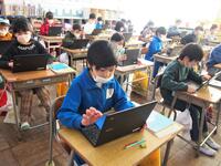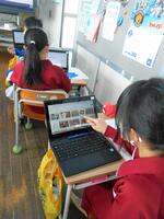 3-1国語「外国のことをしょうかいしよう」社会科や総合的な学習内容も生かして、調べたことをまとめ発表する学習単元です。chromebookを使って紹介したい国を調べていました。(休み時間になっても)