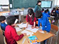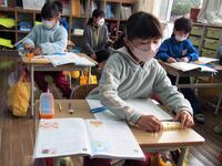 1-2国語「子どもをまもるどうぶつたち」オオアリクイとコチドリの、子どもを守る知恵について比べる学習です。コチドリについて書かれていることを確かめ、自分が書いたものを友達に伝えました。