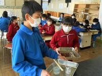 5-1理科「ミョウバンのかざり」水溶液の温度を下げると水に溶けていたミョウバンの粒を取り出せることから、その性質を使ってモール飾りを作る実験中でした。うまく固まるかな…。