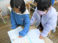 1-2算数「どんなしきになるかな」文章問題の意味を理解し図式化する内容です。ブロックを使ったりノートに図を書いたりしながら理由を説明していました。