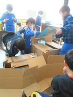 2-2図工「だんだんダンボール」大きなダンボールを使って思い付いたことを試しながら造形活動を楽しむ学習です。イメージをどんどんふくらませていました。