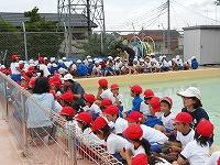 今日のロング昼休みに、プール開きがありました。校長先生のお話の後、6年生の作文発表がありました。今年の水泳目標についての発表でした。その後、体育主任からプール使用上の注意がありました。子どもたちの中から、「早く泳ぎたいな。」という声が聞こえてきました。