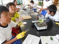 体育集会(指先までしっかり伸びています。) 6年理科の実験の様子(ジャガイモの葉にデンプンが作られています。)