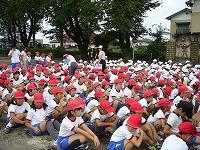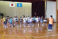 校庭での始業式 町、郡の水泳記録会の賞状伝達 運動委員会による「新一輪車」の紹介