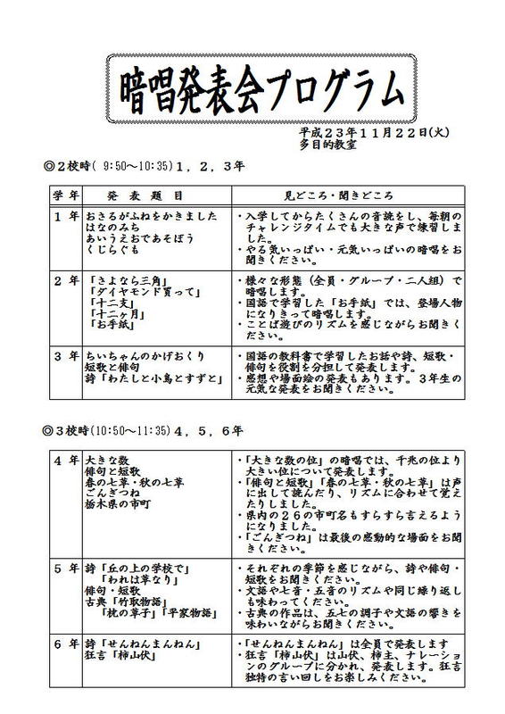 1日(火)読書集会、移動読書教室5年生、学校評議員会議9:25、自由参観日、3年生PTA行事、委員活動