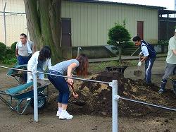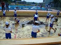 校庭への砂入れ 雨が降っても水たまりができなくなります。