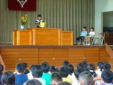 始業式では、校長先生の話や、2・4・6年生代表の作文発表を聞きました。代表の友達は、夏休みの思い出や2学期にがんばりたいことなどを、大きな声で堂々と発表してくれました。また、賞状伝達もあり、町の水泳記録会で活躍した友達や、バレー部が表彰されました。