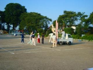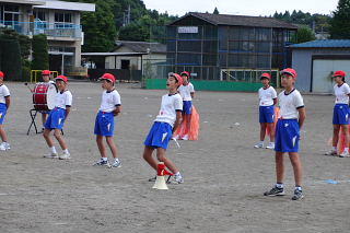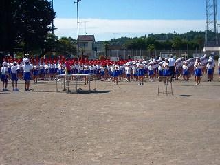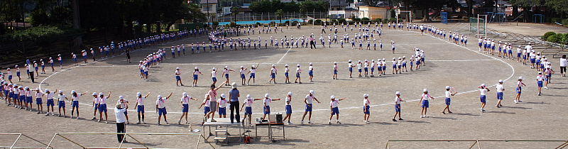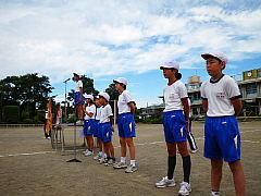 14:10 七井小校庭集合。児童は通学班ごとに整列。保護者はその横に並ぶ。