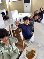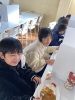 いつも楽しみにしている給食の時間です。今日の献立は、関西風うどん、牛乳、豆腐の土佐揚げ、春雨サラダ、チーズドックでした。みんな、おいしく食べていました。