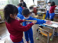 今日の2校時は、4年生と2年生がペアになってなわとび検定を行いました。4年生は、2年生のなわとびを跳ぶ回数を数えるだけでなく、よりたくさん跳ぶための「コツ」を教えている姿も見られ、何ともほほえましかったです。