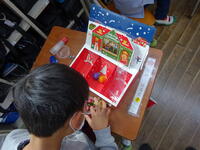 1年生の図工の時間は、持ってきた箱に模様や作った飾り、入れるものを考えながら「かざって なに いれよう」の授業を行っていました。廊下には、授業で作ったクリスマスリースが飾られていました。2年生の算数の時間は、物さしを使って左右の手の先までの長さを求める授業を行っていました。みんな楽しく授業に臨んでいました。