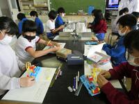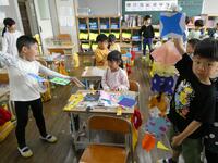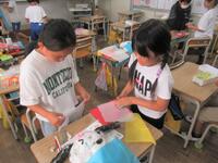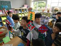 1-2図工「ちょきちょきかざり」重ね合わせた作品をつないで完成です。
