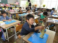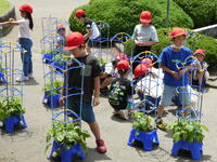 1-1、1-2生活「アサガオのかんさつ」つるが伸びてきたので支柱を立てました。